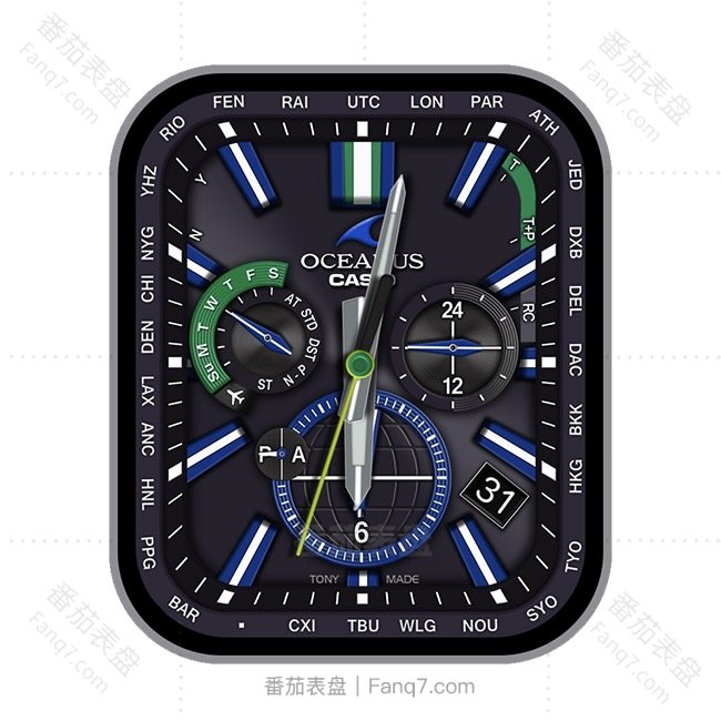 CASIO卡西欧OCEANUS科技蓝绿三盘式日志指针表盘.clock&clcok2