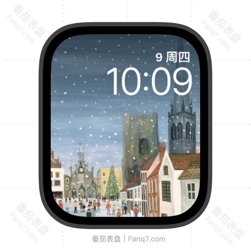 冬日雪花飘逸小镇楼房行人苹果iwatch壁纸表盘.watchface