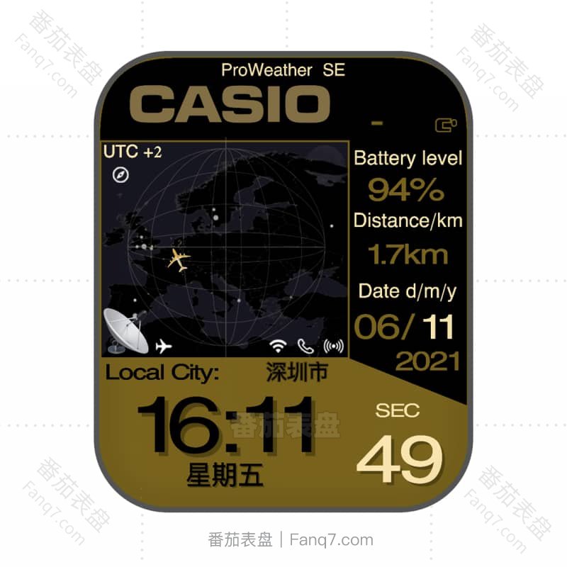Casio卡西欧土色黑色地球飞机飞行轨迹表盘.clock